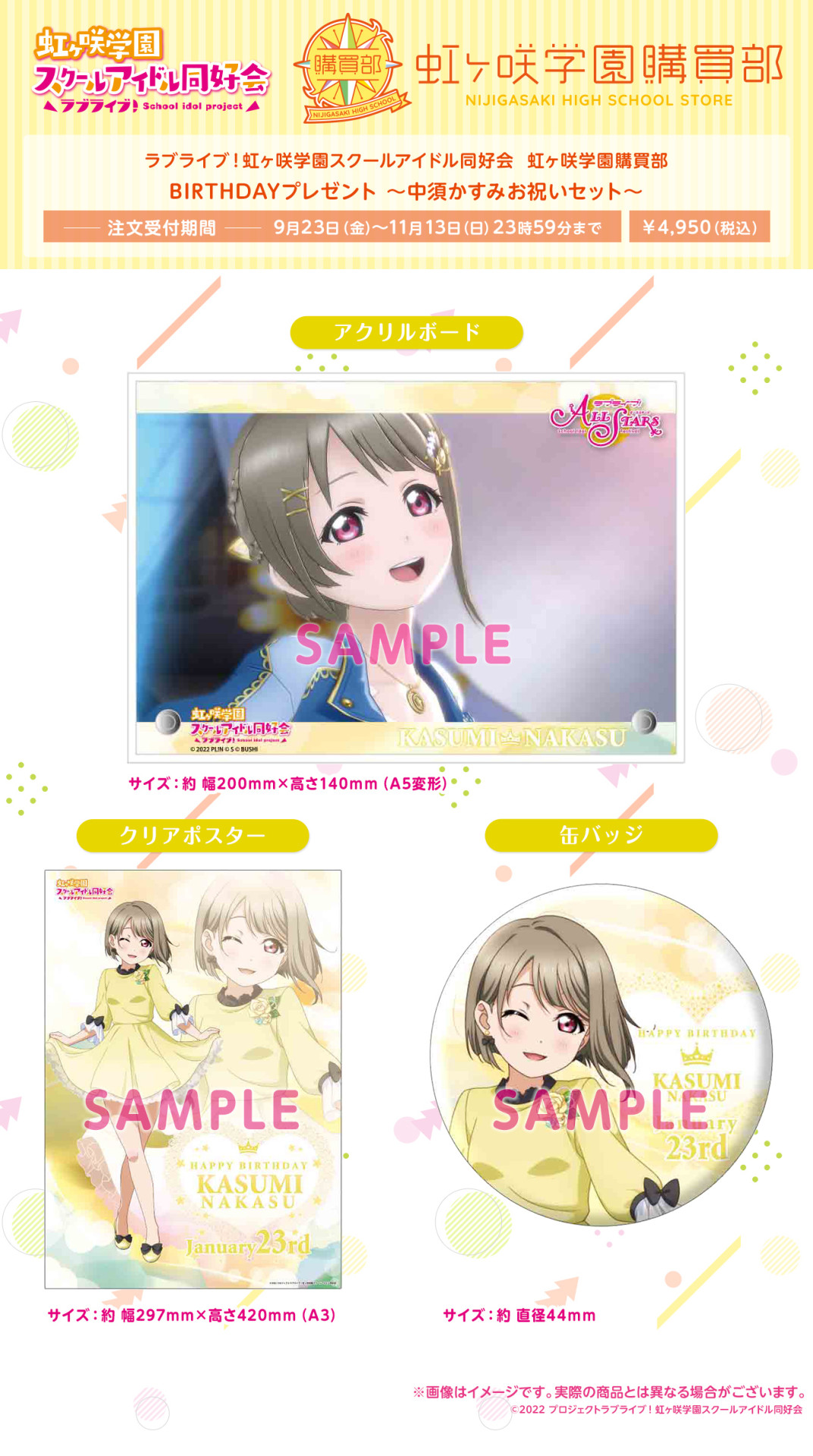皆さんの投票で1位に選ばれたスクスタMVシーンを使用したA5アクリルボードと、新規描き下ろしイラストを使用したA3クリアポスター、缶バッジの3点セットを「BIRTHDAYプレゼント」として受注販売いたします。かすみの誕生日に合わせてお届けします♪
