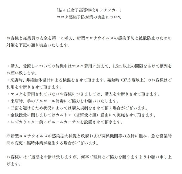 「結ヶ丘女子高等学校キッチンカー」よりメニュー変更のお知らせ